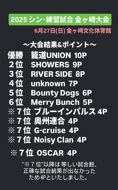 目的 | 公式戦などに参加できない バスケ愛好会やクラブ、バスケ仲間に試合をする機会と挑戦する場を提供するとともに、他チームとの交流も図る。 |