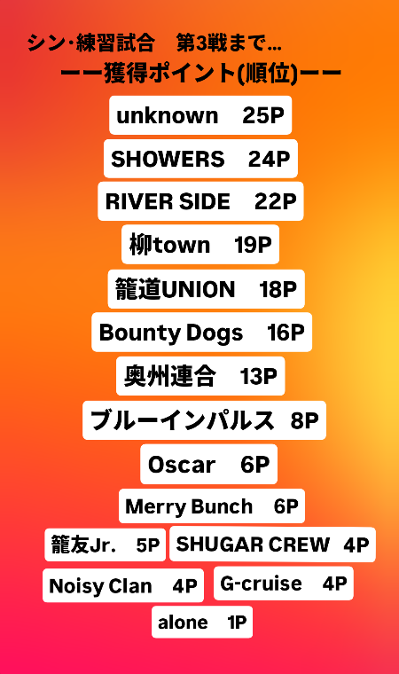 注意 | ①レギュラーチームに申し込んだチームは、必ず全4戦に出場しなければならないということではありません。 欠場する場合は、その一ヶ月前には キャンセルの連絡をして下さい。 ②シリーズ戦(レギュラー)に申し込んだチームは、なるべく毎戦 同じメンバーが理想ですが、総入れ替えなどはせず 6〜7割は同じメンバーで出場して下さい。 |