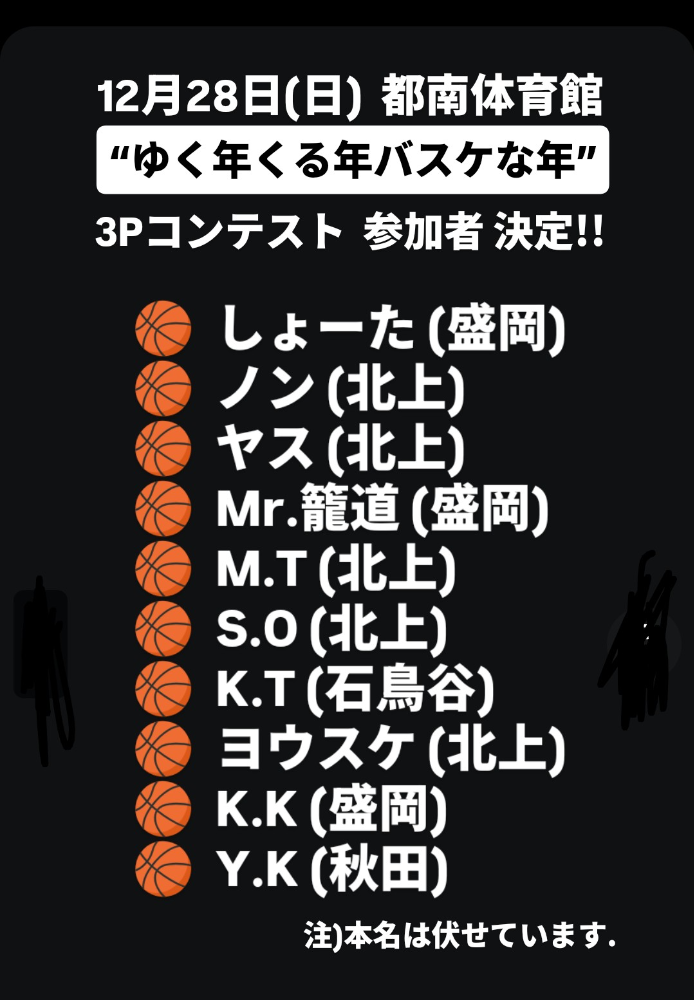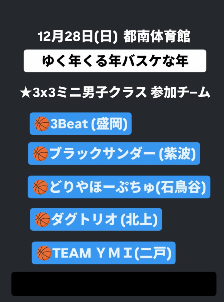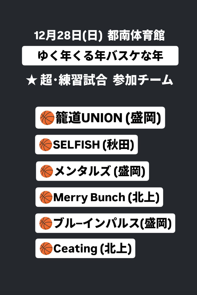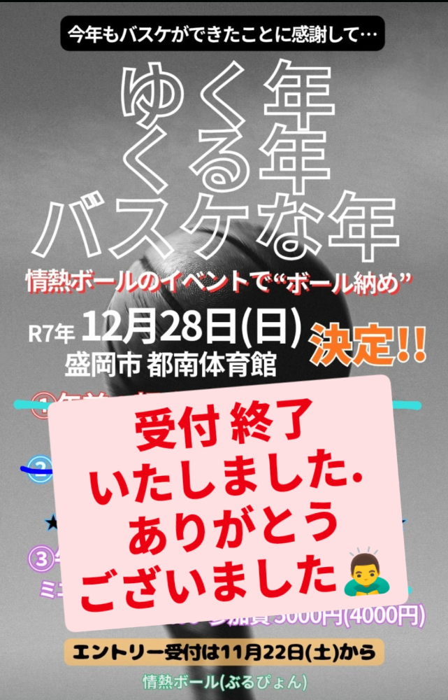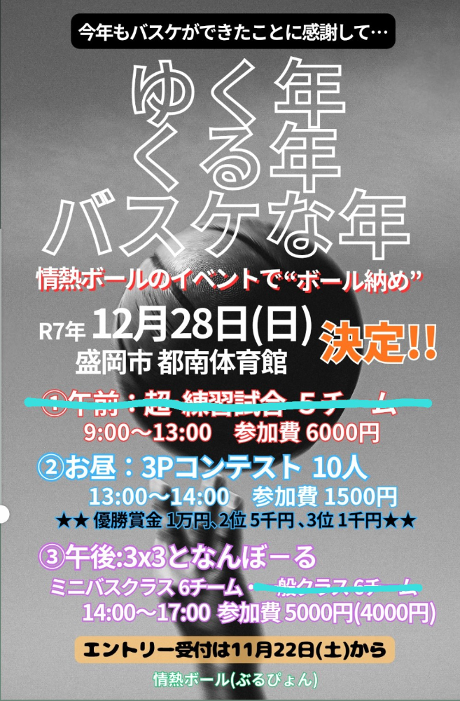 | 大会名称 | ゆく年 くる年 バスケな年 “ボール納め”バスケ大会 |